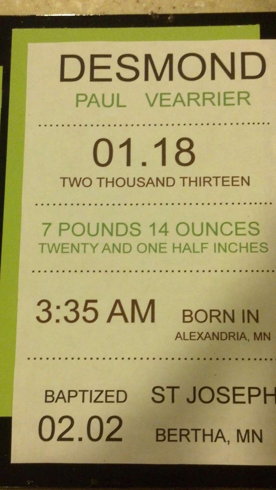 Using Microsoft Word, I printed the details of his birth.